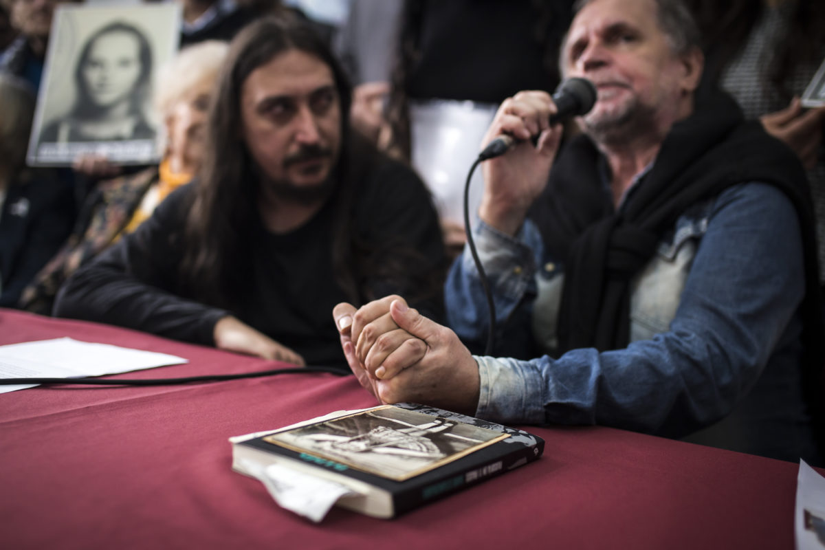 Javier Matías al lado de su tío, Roberto, que sostiene una foto de su hermana Elena, desaparecida en 1977. Foto: Martina Perosa.